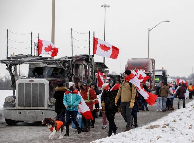在多伦多的大街上,人们排成一列挥舞着加拿大国旗,举着谴责强制疫苗的标语,为卡车司机加油助威。该抗议活动受到了加拿大货运联盟的谴责,许多卡车司机也在社交媒体上发帖称,他们仍在继续工作,车队游行不能代表他们的立场。