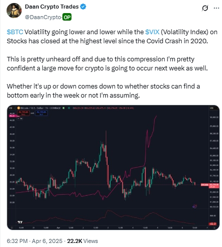 著名交易员Daan Crypto Trades在其最新分析中承认:“比特币波动率越来越低,而股票VIX(波动率指数)已收于2020年新冠疫情崩盘以来的最高水平。这是闻所未闻的,由于这种压缩,我非常有信心加密货币本周也会出现大幅波动。我认为,无论是上涨还是下跌,都取决于股市能否在本周初触底。”