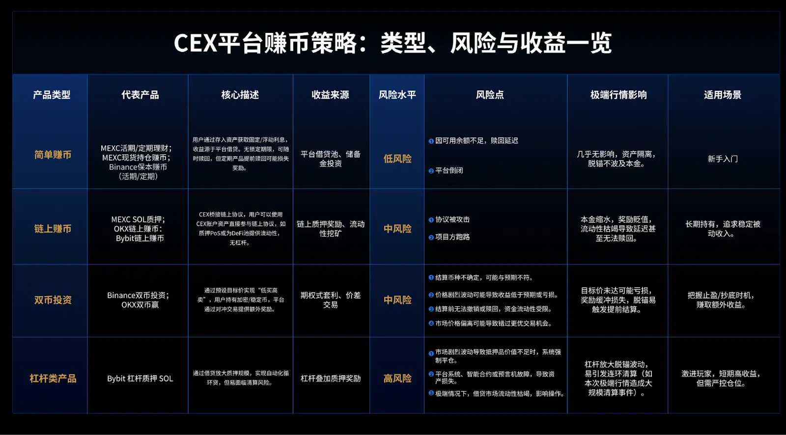 目前,CEX理财产品主要分为四种类型,覆盖从基础储蓄到杠杆放大的多样需求。低风险产品类似于“加密定期存款”,强调保本保息;高风险产品则接近“杠杆期货”,收益与风险均因杠杆而放大。下面按风险梯度依次拆解。