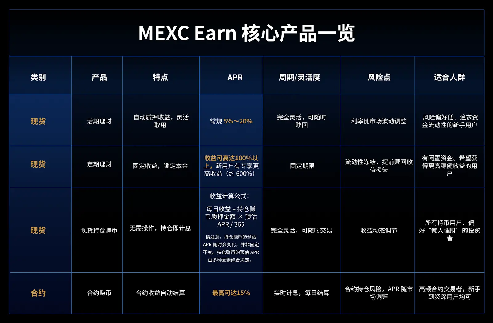 1. 稳健型主力阵容:活期、定期、现货持仓赚币、合约赚币