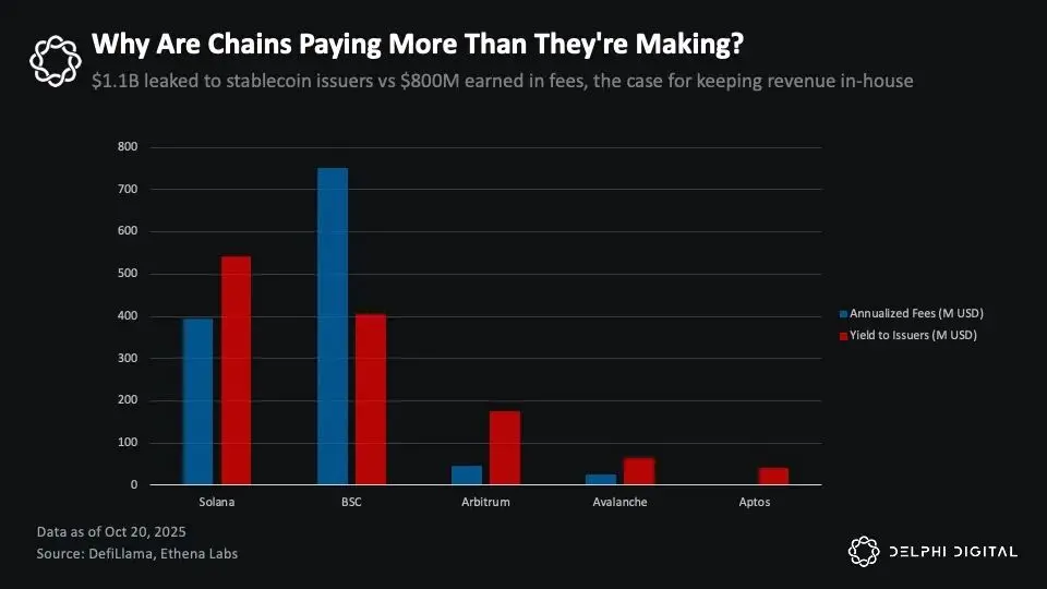超过 300 亿美元的 USDC 和 USDT 闲置在 Solana、BSC、Arbitrum、Avalanche 和 Aptos 等链上,每年为 Circle 和 Tether 贡献约 11 亿美元的收益(假设储备收益率为 4%)。这一数字比这些链的交易手续费总收入高出约 40%。这种不平衡凸显了稳定币已经成为 L1、L2 和应用程序中最大的未充分货币化领域。