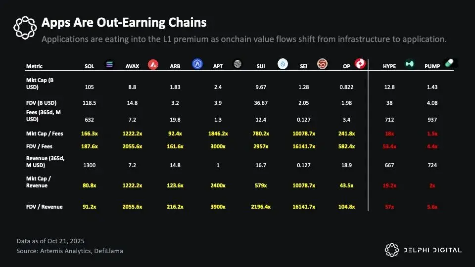 这一现象清晰地揭示了行业正在经历的权力转移:应用程序的估值越来越多地基于其实际产生的收入以及对生态系统的回馈,而公链仍在为其高估值寻找合理化依据。L1 公链的估值溢价(L1 Premium)正逐步被侵蚀,未来的趋势愈发明朗。