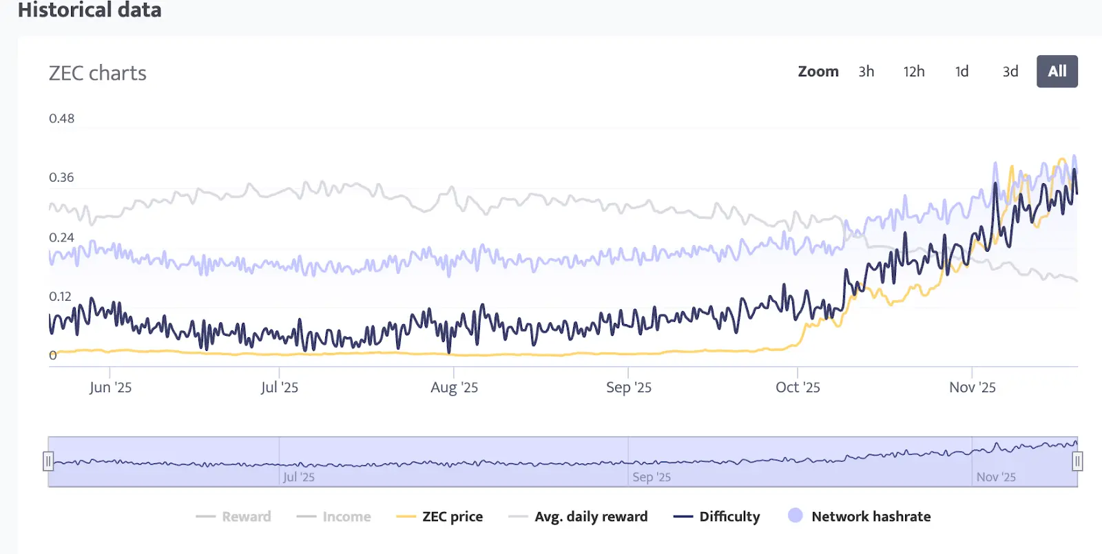 过去两个月,ZEC 的高收益正在快速吸引算力进场,全网 hashrate 开始显著增长,difficulty 也已经进入升高周期。从图表可以清楚看到,ZEC 的 price(黄色线)在 9 月底开始脱离横盘状态,而 hashrate(淡紫色)与 difficulty(深蓝色)随之出现同步抬升。这一段走势意味着挖矿端已经开始对价格上涨做出反应。