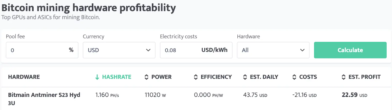 为了计算每日收益,我们将 Z15 Pro 的参数带入挖矿收益计算器,并按标准矿工设定: