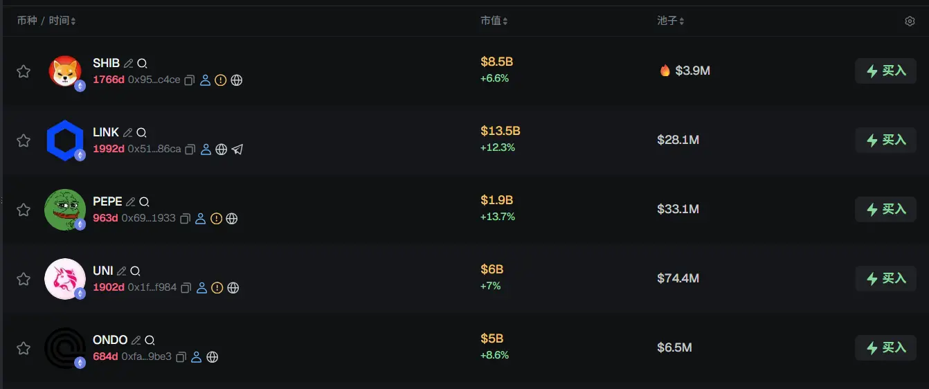 过去 24h ETH 热门代币前五依次为:SHIB、LINK、PEPE、UNI、ONDO
