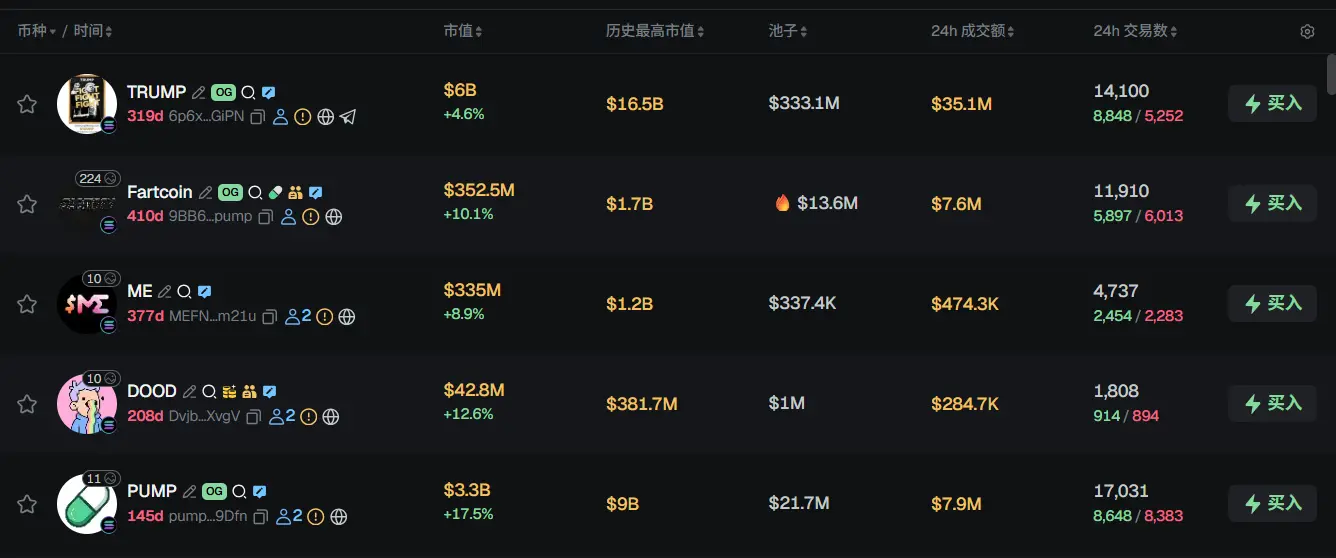 过去 24h Solana 热门代币前五依次为:TRUMP、Fartcoin、ME、DOOD、PUMP
