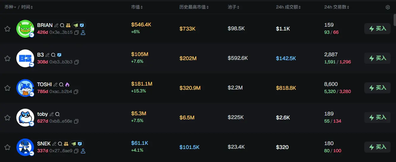 过去 24h Base 热门代币前五依次为:BRIAN、B3、TOSHI、toby、SENK