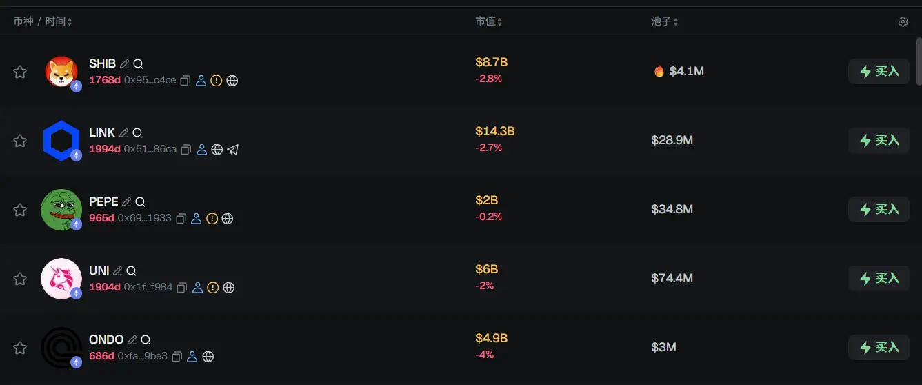 过去 24h ETH 热门代币前五依次为:SHIB、LINK、PEPE、UNI、ONDO
