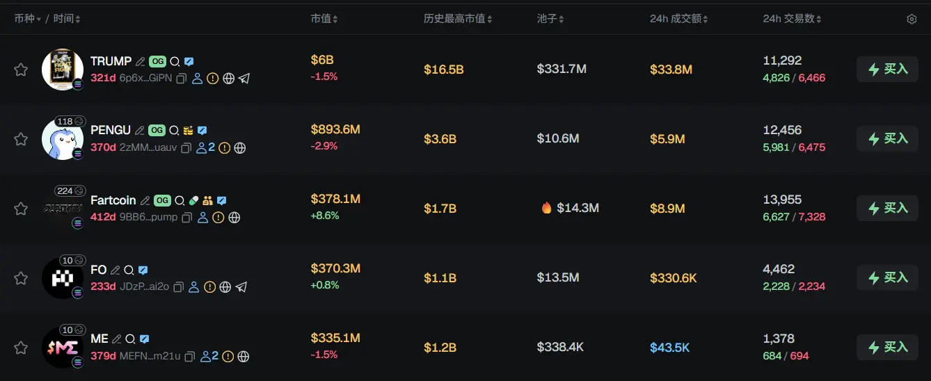 过去 24h Solana 热门代币前五依次为:TRUMP、PENGU、Fartcoin、FO、ME