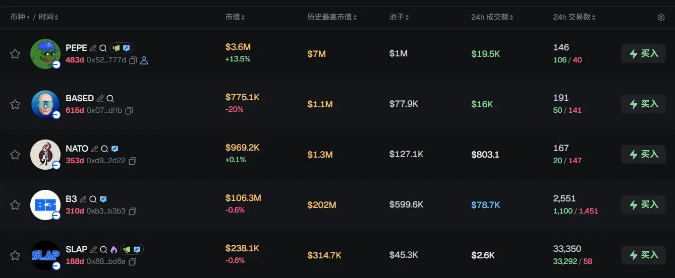 过去 24h Base 热门代币前五依次为:PEPE、BASED、NATO、B3、SLAP
