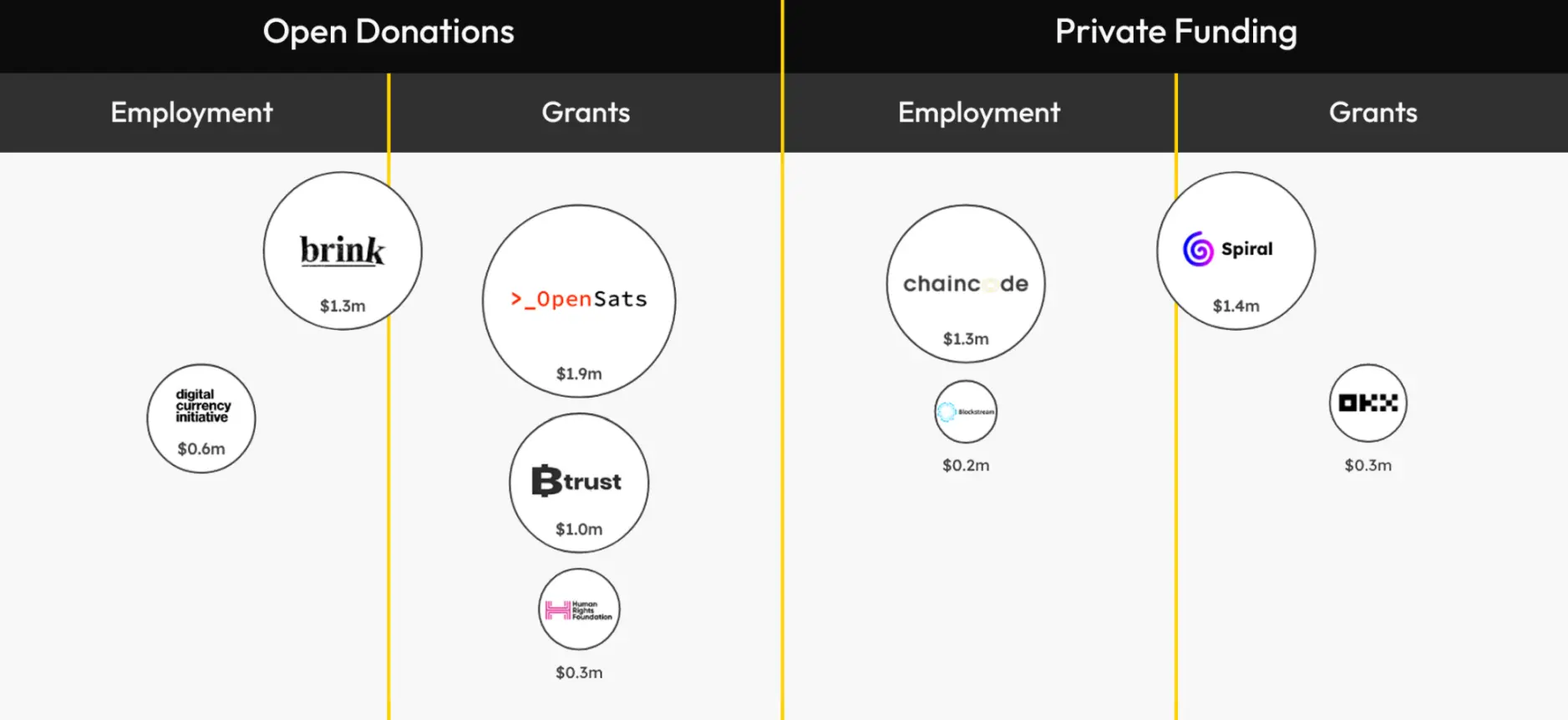 Brink 的运营资金 100% 来自于捐赠,捐赠者包括 Twitter 联创 Jack Dorsey,前文提及的 Chaincode Labs、HRF、Spiral,还包括了 Gemini、Bitfinex、Kraken 等交易平台以及数百名个人捐助者。