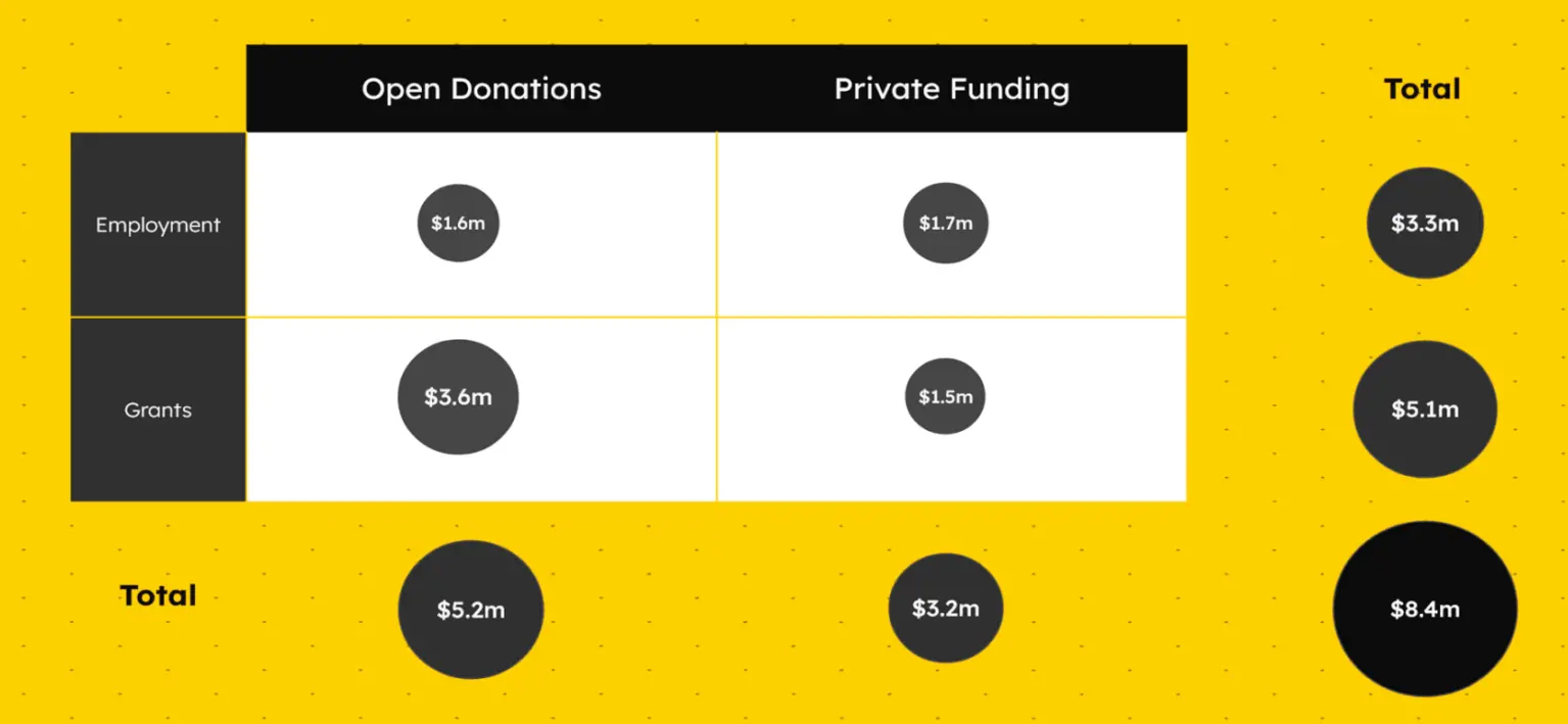 有关金额方面,作者表示有一些数字是基于公开信息进行的估算,并非完全的准确。报告称,公开接受捐赠组织的总支出(61.5%)几乎是公司(38.5%)的两倍,资助(60.8%)超过了工资(39.2%)。而差异主要来自于捐赠组织的资助总额(70%)远高于公司实体的资助(30%),而工资支出总额两者相近。