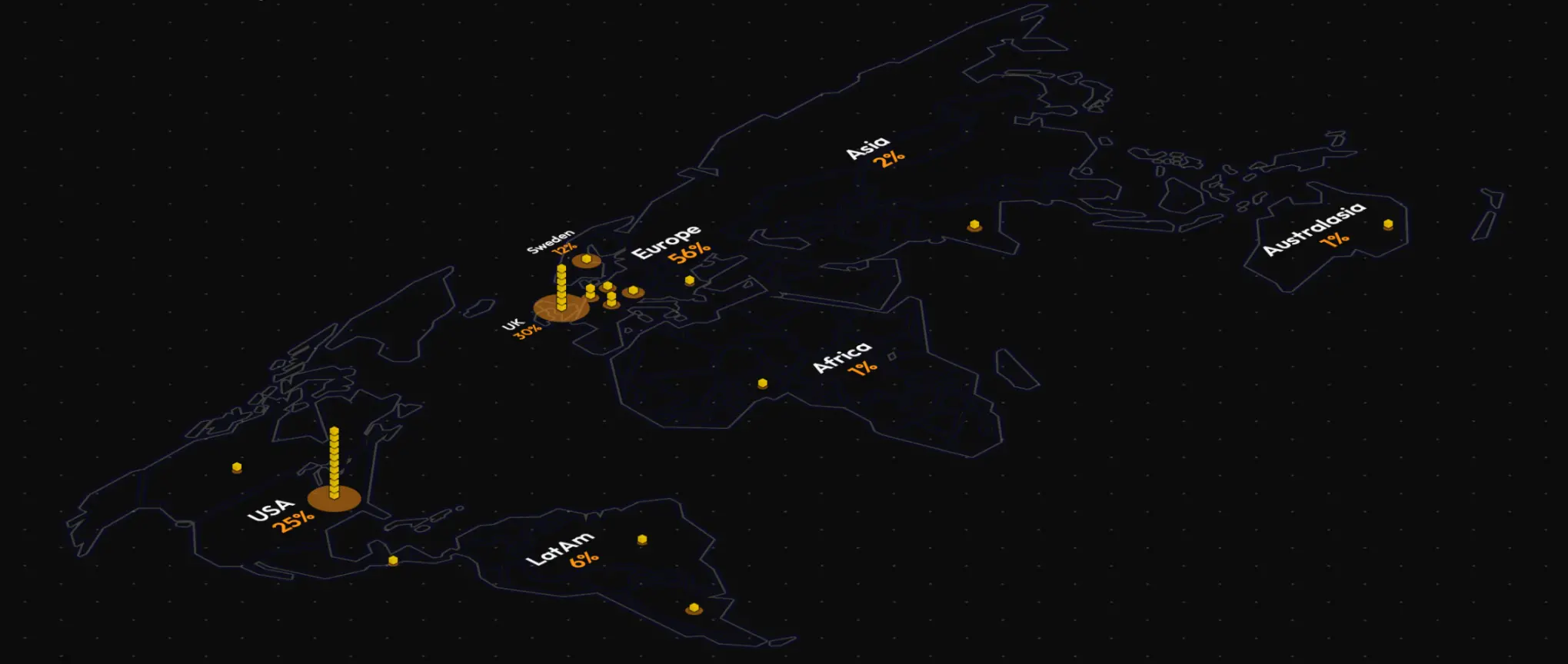 报告显示,截至 2024 年已有至少 5 次提交被合并进 Bitcoin Core 的 41 位活跃核心开发者中,有 33 位公开披露了自己的所在地。