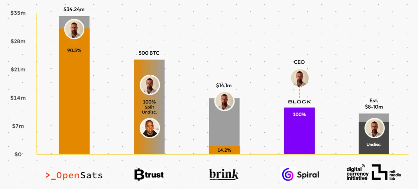 虽然当前的资助组织看起来去中心化程度不低,但实际有 5 个组织的资金或多或少都来自 Jack Dorsey。