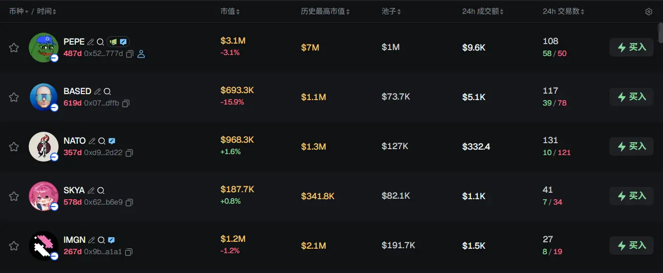 过去 24h Base 热门代币前五依次为:PEPE、BASED、NATO、SKYA、IMGN