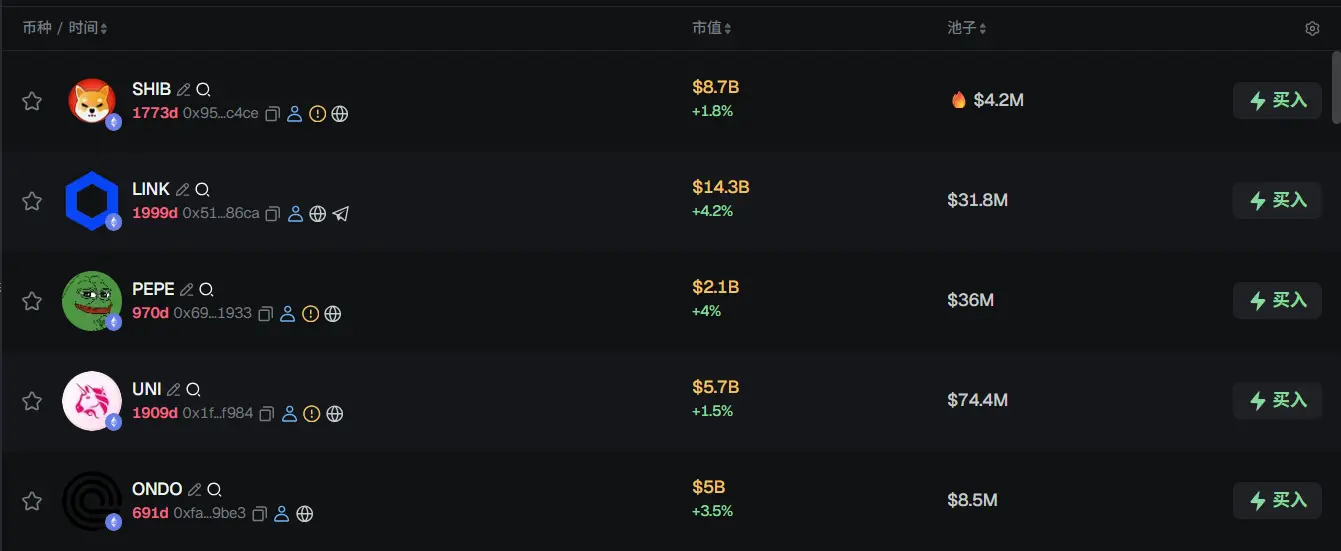 过去 24h ETH 热门代币前五依次为:SHIB、LINK、PEPE、UNI、ONDO