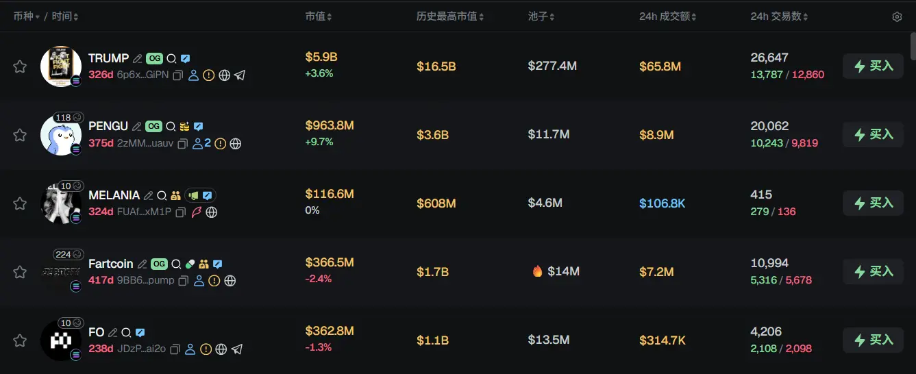 过去 24h Solana 热门代币前五依次为:TRUMP、PENGU、MELANIA、Fartcoin、FO