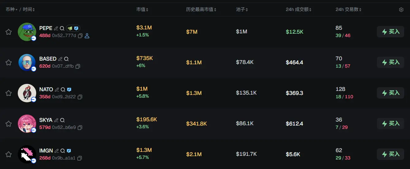 过去 24h Base 热门代币前五依次为:PEPE、BASED、NATO、SKYA、IMGN