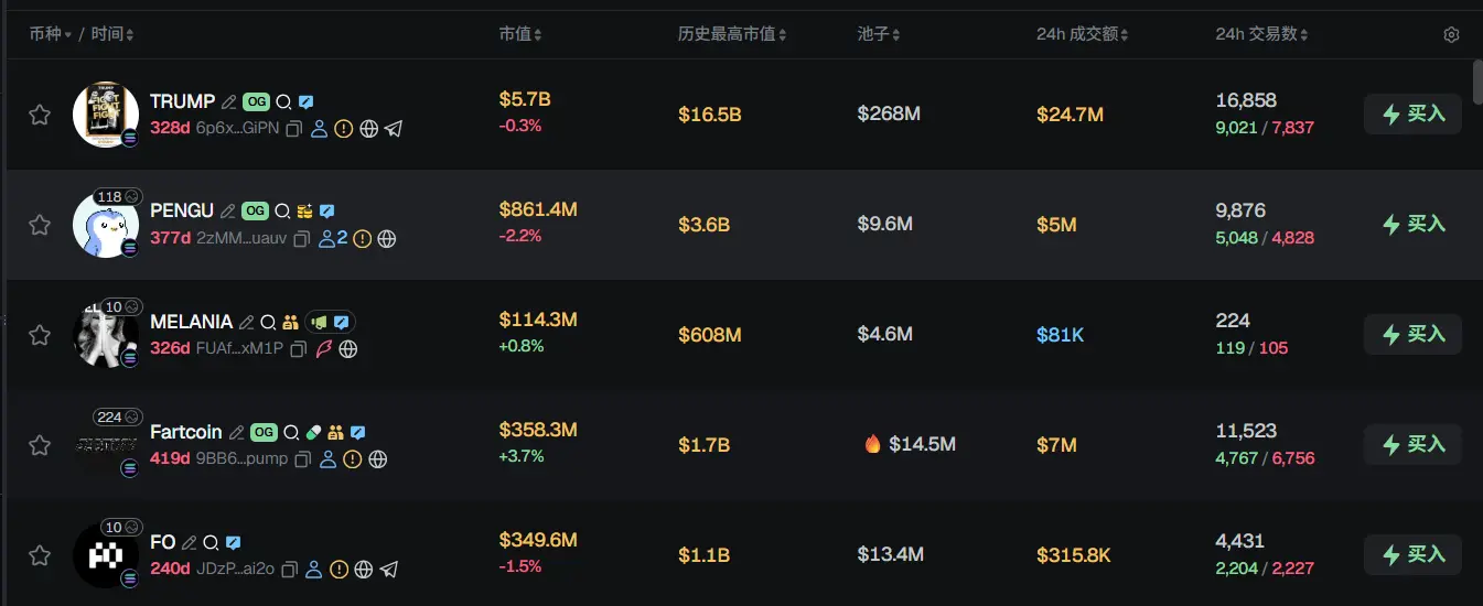 过去 24h Solana 热门代币前五依次为:TRUMP、PENGU、MELANIA、Fartcoin、FO