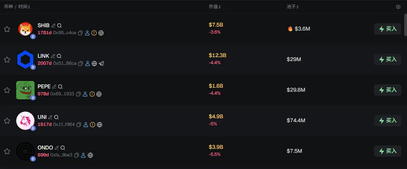 过去 24h ETH 热门代币前五依次为:SHIB、LINK、PEPE、UNI、ONDO
