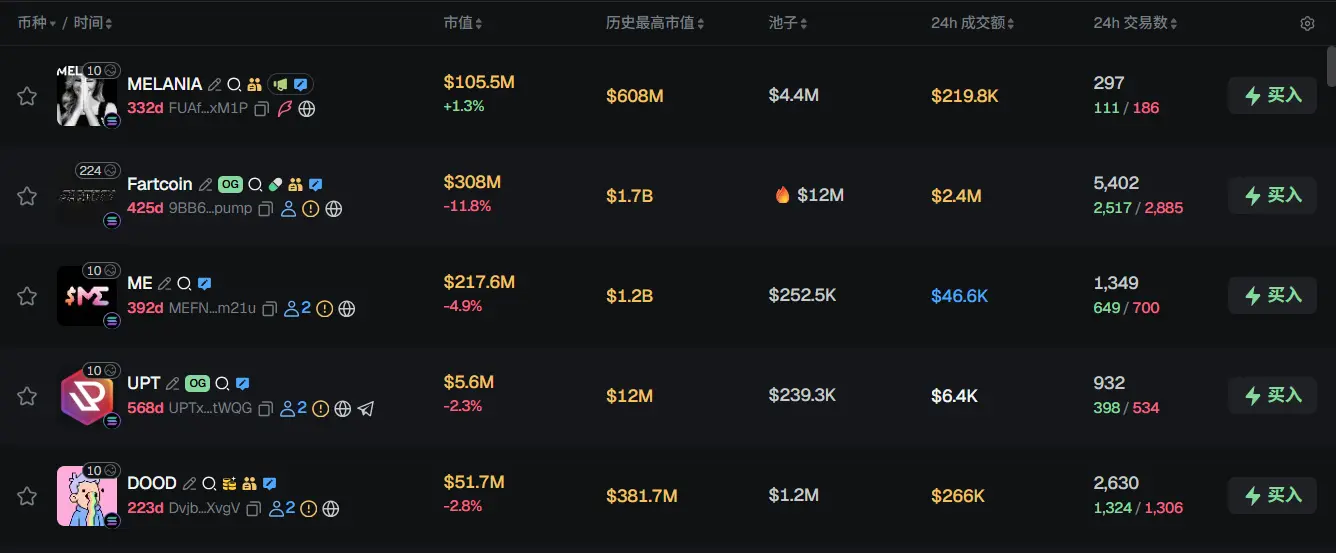 过去 24h Solana 热门代币前五依次为:MELANIA、Fartcoin、ME、UPT、DOOD
