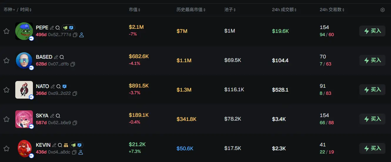 过去 24h Base 热门代币前五依次为:PEPE、BASED、NATO、SKYA、KEVIN