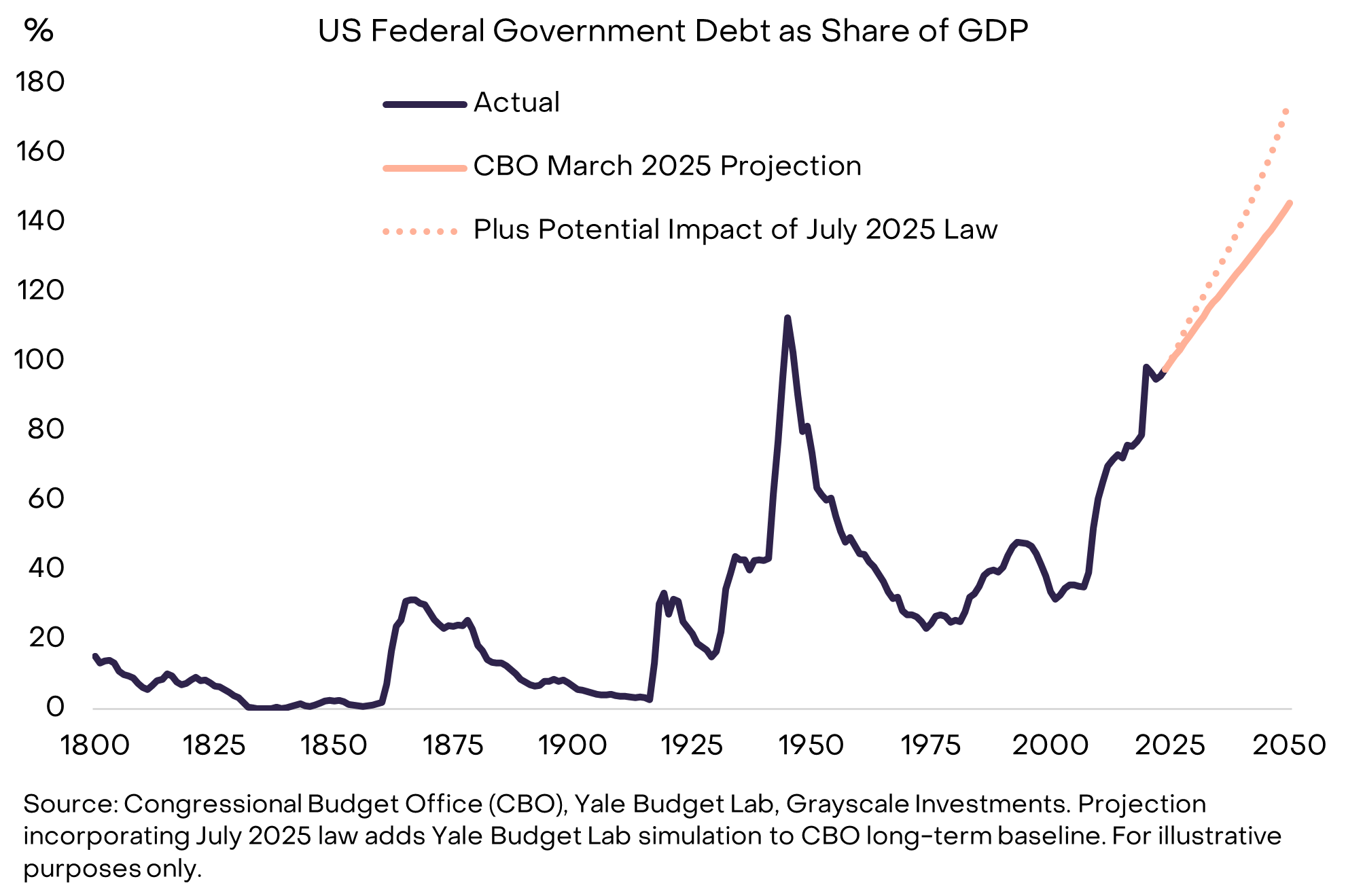 美国经济正面临债务问题(详见图3),这可能最终会削弱美元作为价值储存工具的角色。其他国家也面临类似问题,但由于美元是当前全球主导的国际货币,美国政策的可信度对潜在资本流动的影响更为重要。在我们看来,仅有少数数字资产可以被视为可行的价值储存工具,这些资产具备足够广泛的采用度、高度的去中心化特性,以及有限的供应增长能力。其中包括按市值计算的两大加密资产,比特币(Bitcoin)和以太坊(Ethereum)。与实物黄金类似,它们的价值部分来源于其稀缺性和自主性。