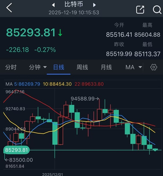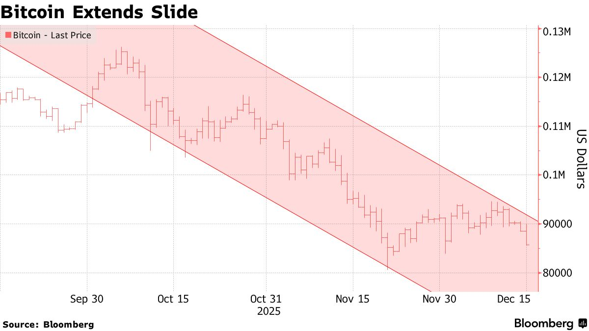 比特币两周来首次跌破 86,000 美元,随着最大加密货币进一步滑入熊市区间,投资者情绪明显走弱。周一,比特币一度下跌 3.7%,最低触及 85,171 美元。其他加密货币跌幅更大。以太坊、狗狗币和 瑞波币 均下跌约 5%,加密相关股票也同步走低。