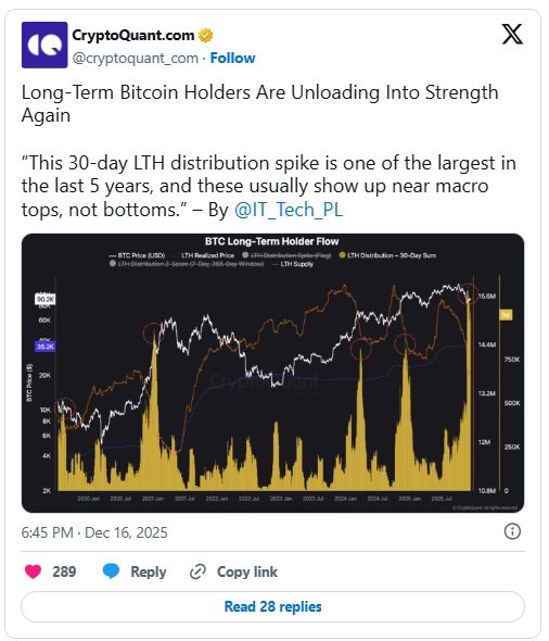 仅在2025年,就有价值近3,000亿美元、此前已“沉睡”超过一年的比特币重新进入流通。链上分析公司CryptoQuant表示,过去30天出现了五年多以来最猛烈的长期持有者抛售之一。