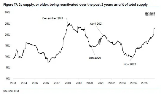 K33 Research的一份报告称,自2023年初以来,至少两年未发生过转移的比特币数量减少了160万枚,按当前价值约合1,400亿美元。这表明长期持有者正在持续卖出。