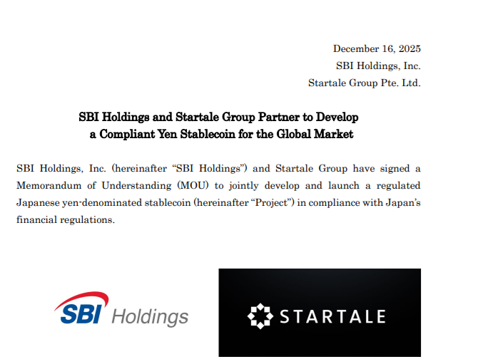 日本金融集团SBI Holdings和Web3基础设施公司 Startale Group 已于2025年12月16日签署谅解备忘录(MoU),计划开发一种完全受监管的日元计价稳定币,目标是代币化资产市场和全球结算。