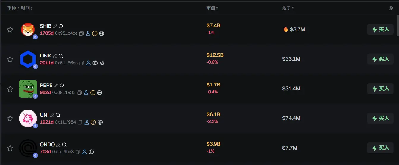过去 24h ETH 热门代币前五依次为:SHIB、LINK、PEPE、UNI、ONDO