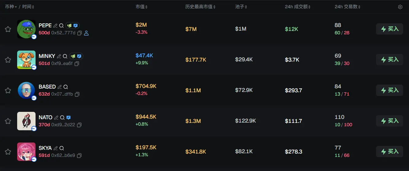 过去 24h Base 热门代币前五依次为:PEPE、MINKY、BASED、NATO、SKYA