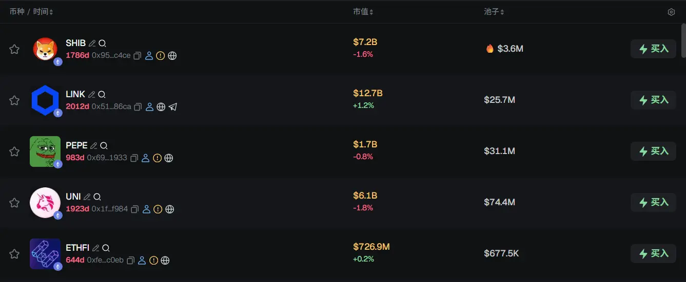 过去 24h ETH 热门代币前五依次为:SHIB、LINK、PEPE、UNI、ETHFI