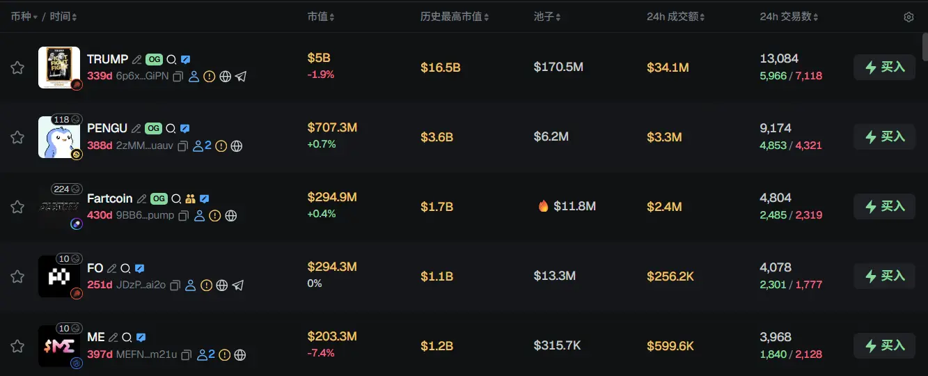 过去 24h Solana 热门代币前五依次为:TRUMP、PENGU、Fartcoin、FO、ME