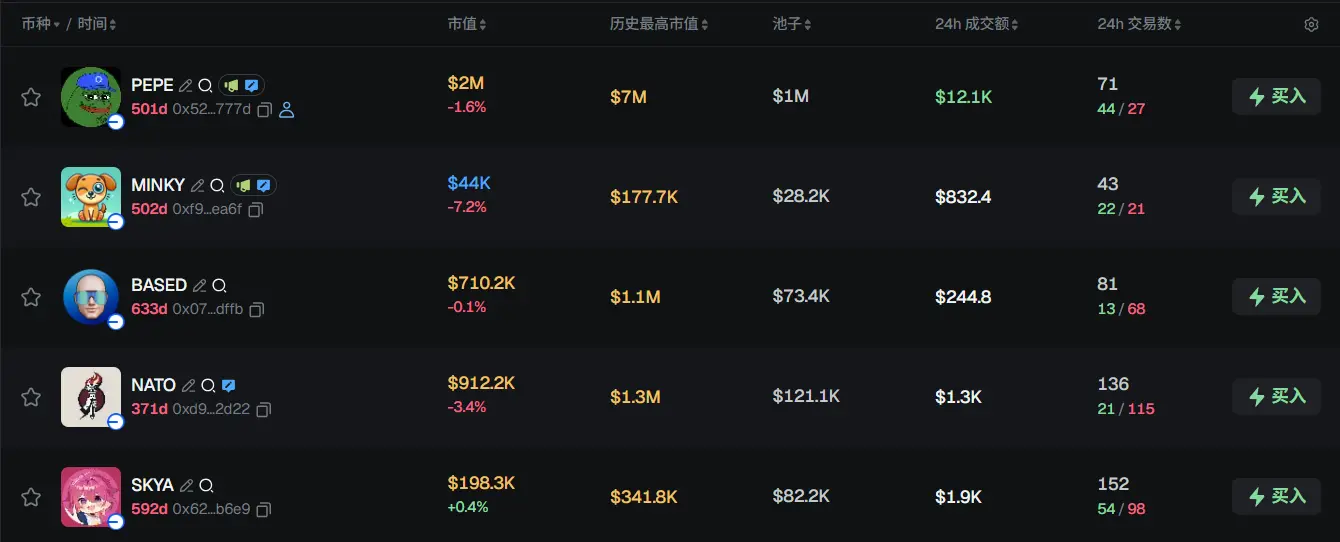 过去 24h Base 热门代币前五依次为:PEPE、MINKY、BASED、NATO、SKYA