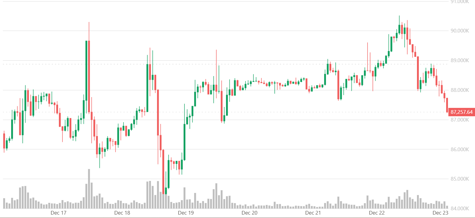 FX168财经报社(亚太)讯 周二(12月23日)亚洲交易时段,比特币继续在9万美元下方窄幅震荡,昨日冲击9万大关失败,价格再度回到熟悉的区间内。随着市场正式进入年末冲刺阶段,加密货币板块在经历10月的暴跌后,整体仍处于迷茫状态。