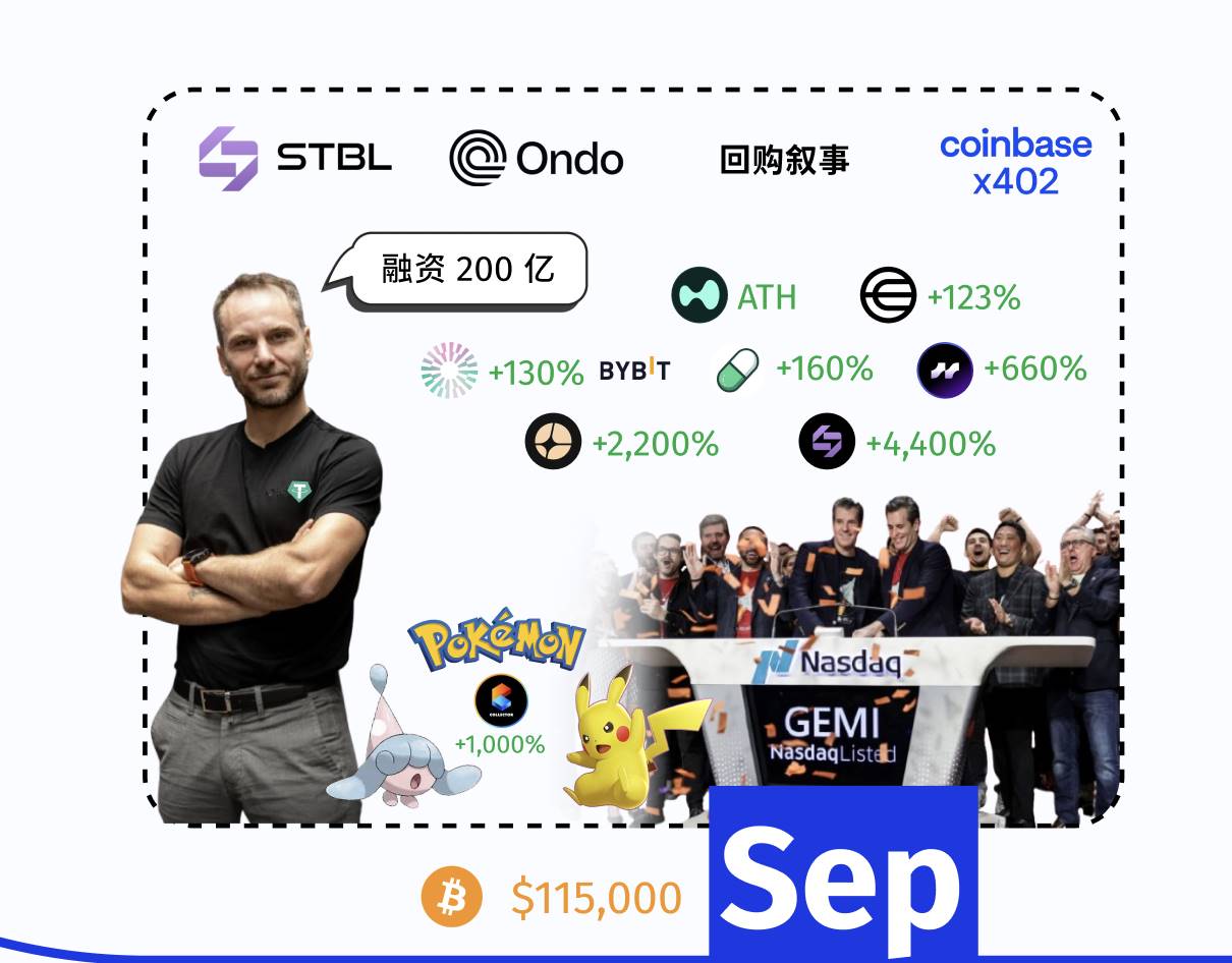 代币方面,PUMP 靠着激进的回购策略(累计回购超$95M)月涨 160%,9 月 14 日创下 ATH。AVNT 一周速通 Upbit 和 Binance 双上线涨 660%。BNB 在富兰克林 Templeton 扩展 Benji 平台后涨 19.7%。MNT 因被整合进 Bybit 生态涨 130%。