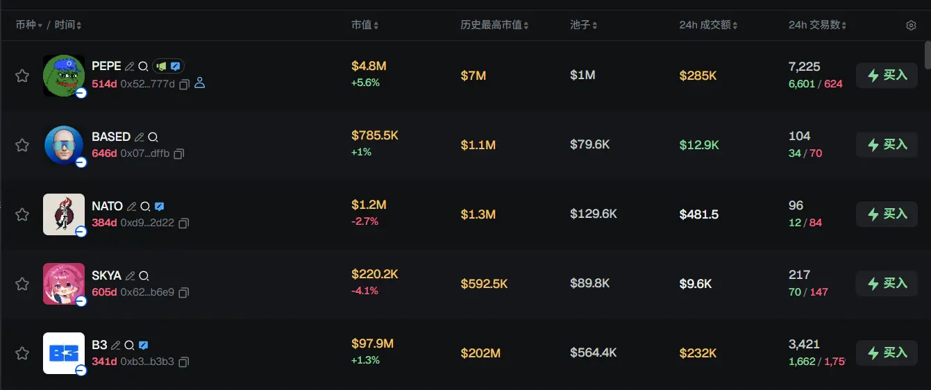 过去 24h Base 热门代币前五依次为:PEPE、BASED、NATO、SKYA、B3