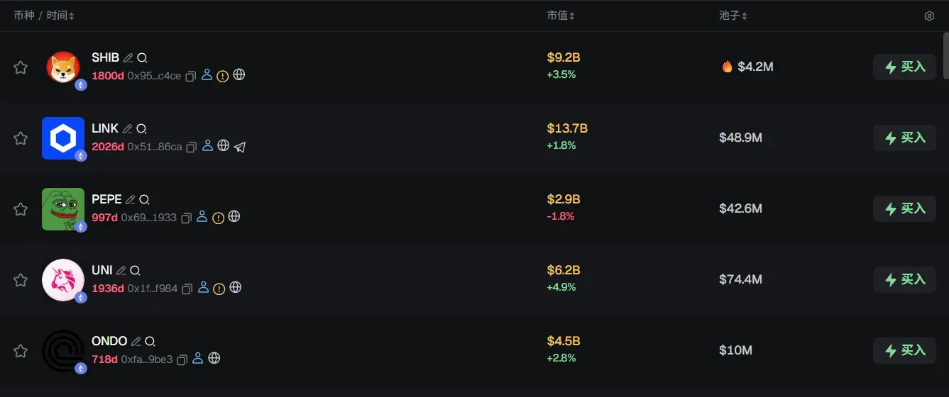 过去 24h ETH 热门代币前五依次为:SHIB、LINK、PEPE、UNI、ONDO