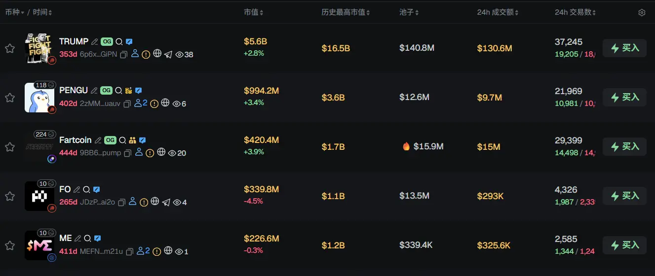 过去 24h Solana 热门代币前五依次为:TRUMP、PENGU、Fartcoin、FO、ME