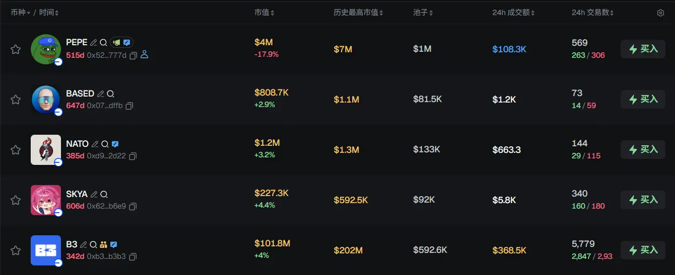 过去 24h Base 热门代币前五依次为:PEPE、BASED、NATO、SKYA、B3