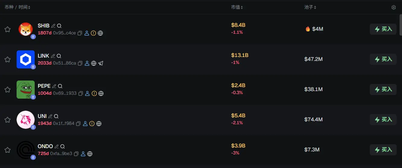 过去 24h ETH 热门代币前五依次为:SHIB、LINK、PEPE、UNI、ONDO