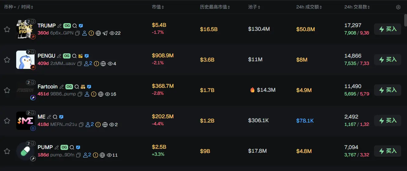 过去 24h Solana 热门代币前五依次为:TRUMP、PENGU、Fartcoin、ME、PUMP