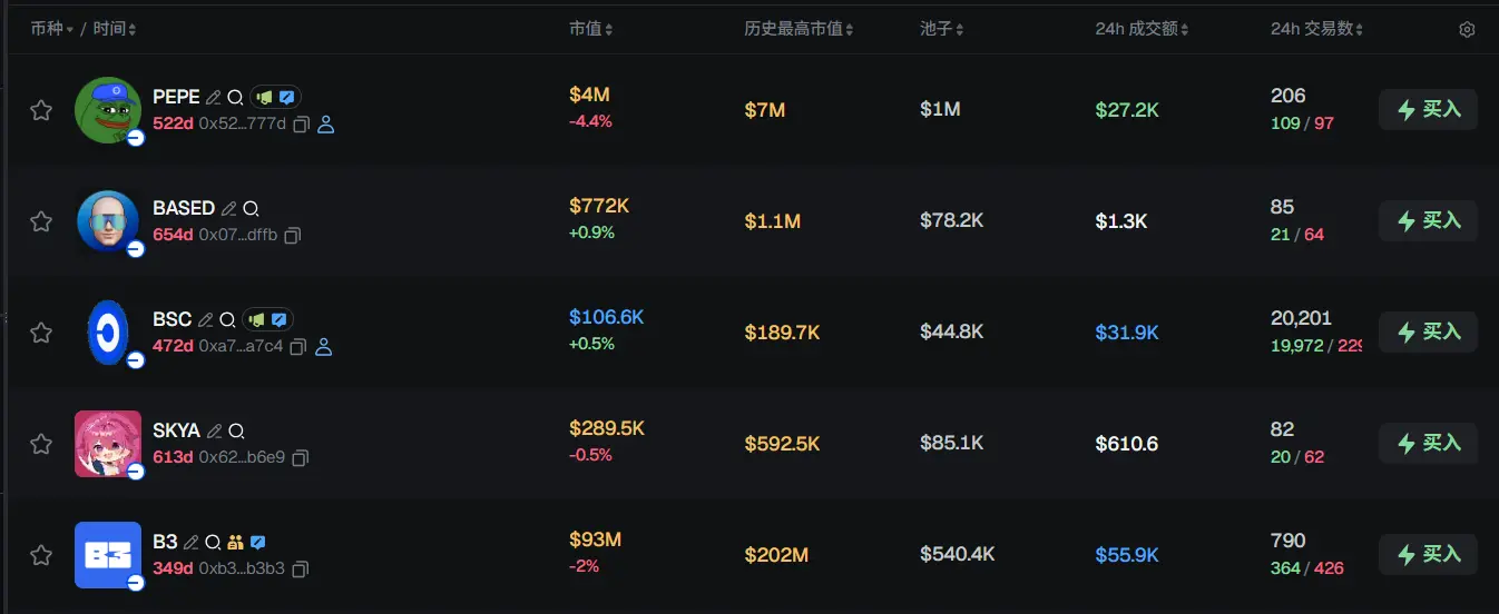 过去 24h Base 热门代币前五依次为:PEPE、BASED、BSC、SKYA、B3