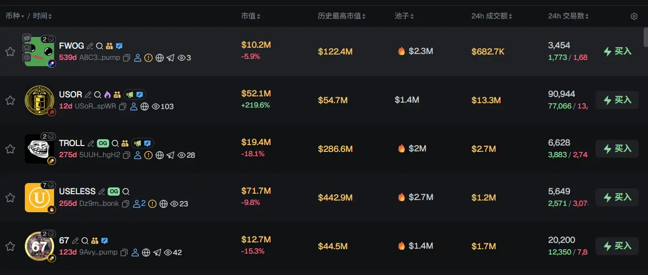 过去 24h Solana 热门代币前五依次为:FWOG、USOR、TROLL、USELESS、67