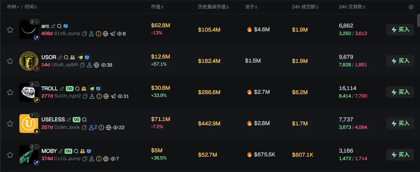 过去 24h Solana 热门代币前五依次为:arc、USOR、TROLL、USELESS、MOBY