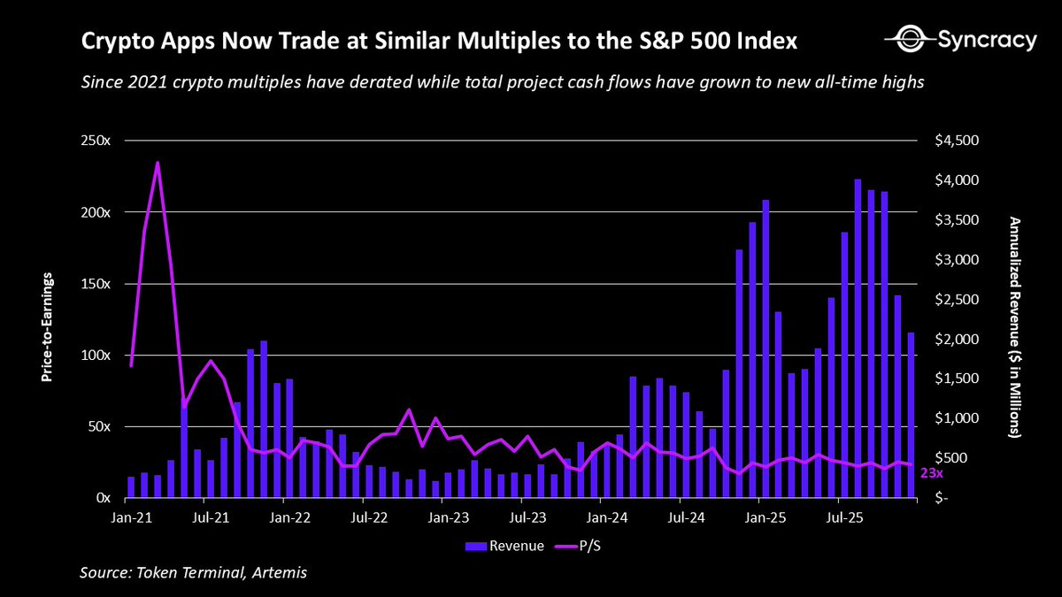 同时,市场对于一个简单且经受过时间考验的原则达成了日益增长的共识:除了比特币(BTC)和以太坊(ETH)这类罕见的价值存储资产外,99.9% 的资产都需要产生现金流(Cash flows)。随着更多基本面投资者进入该资产类别,这些框架只会被进一步强化,理性程度随之增加。