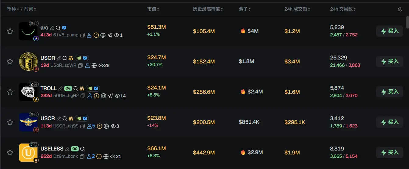过去 24h Solana 热门代币前五依次为:arc、USOR、TROLL、USCR、USELESS