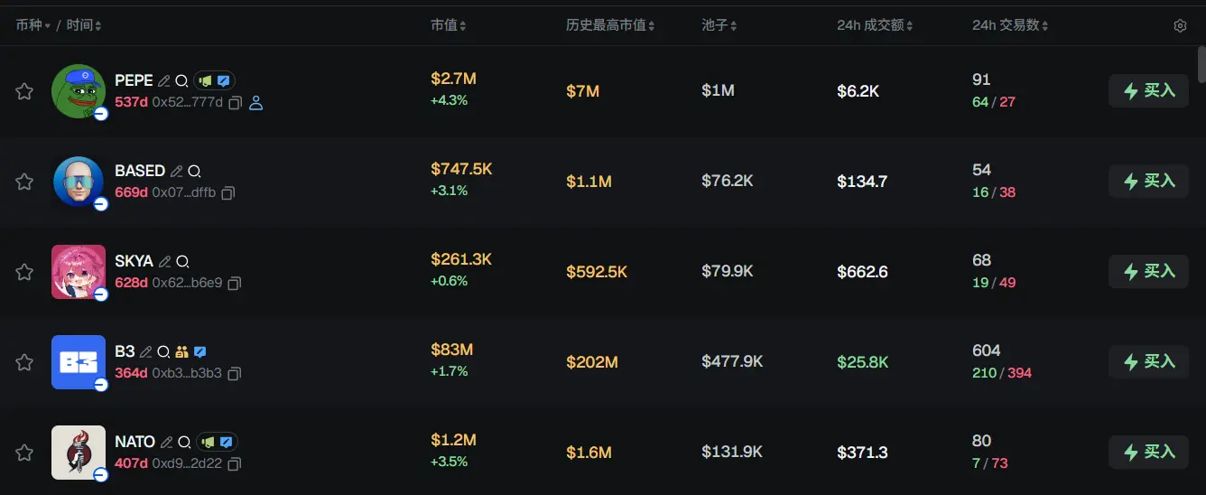 过去 24h Base 热门代币前五依次为:PEPE、BASED、SKYA、B3、NATO